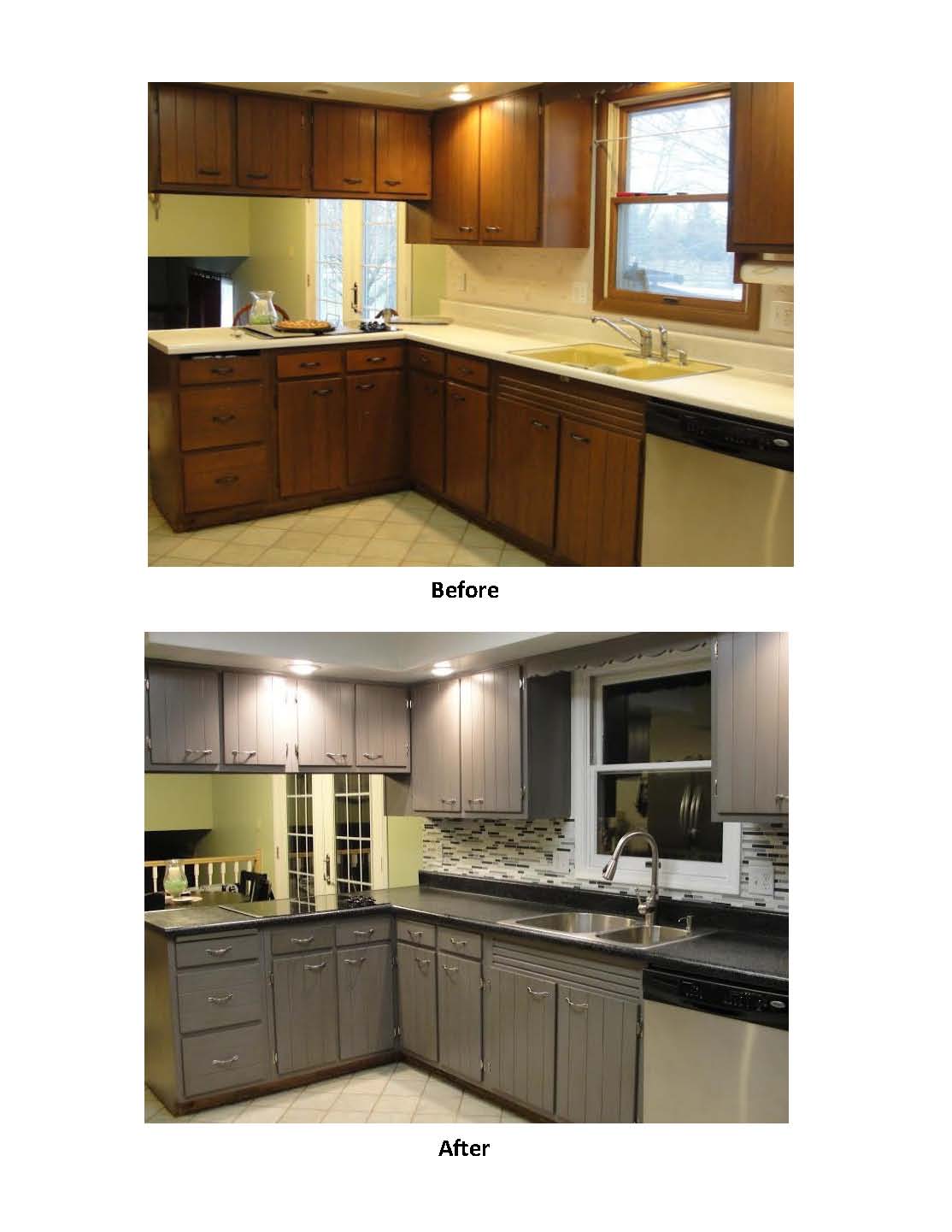 - Before and After kitchen, dark wood to gray cabinets