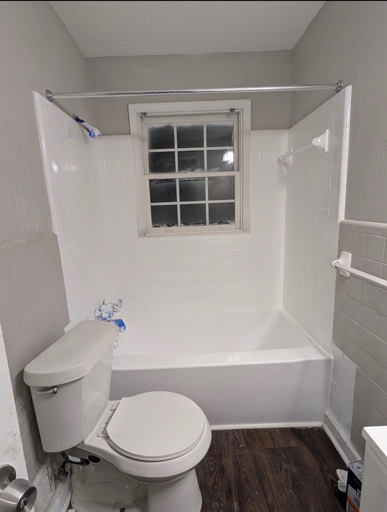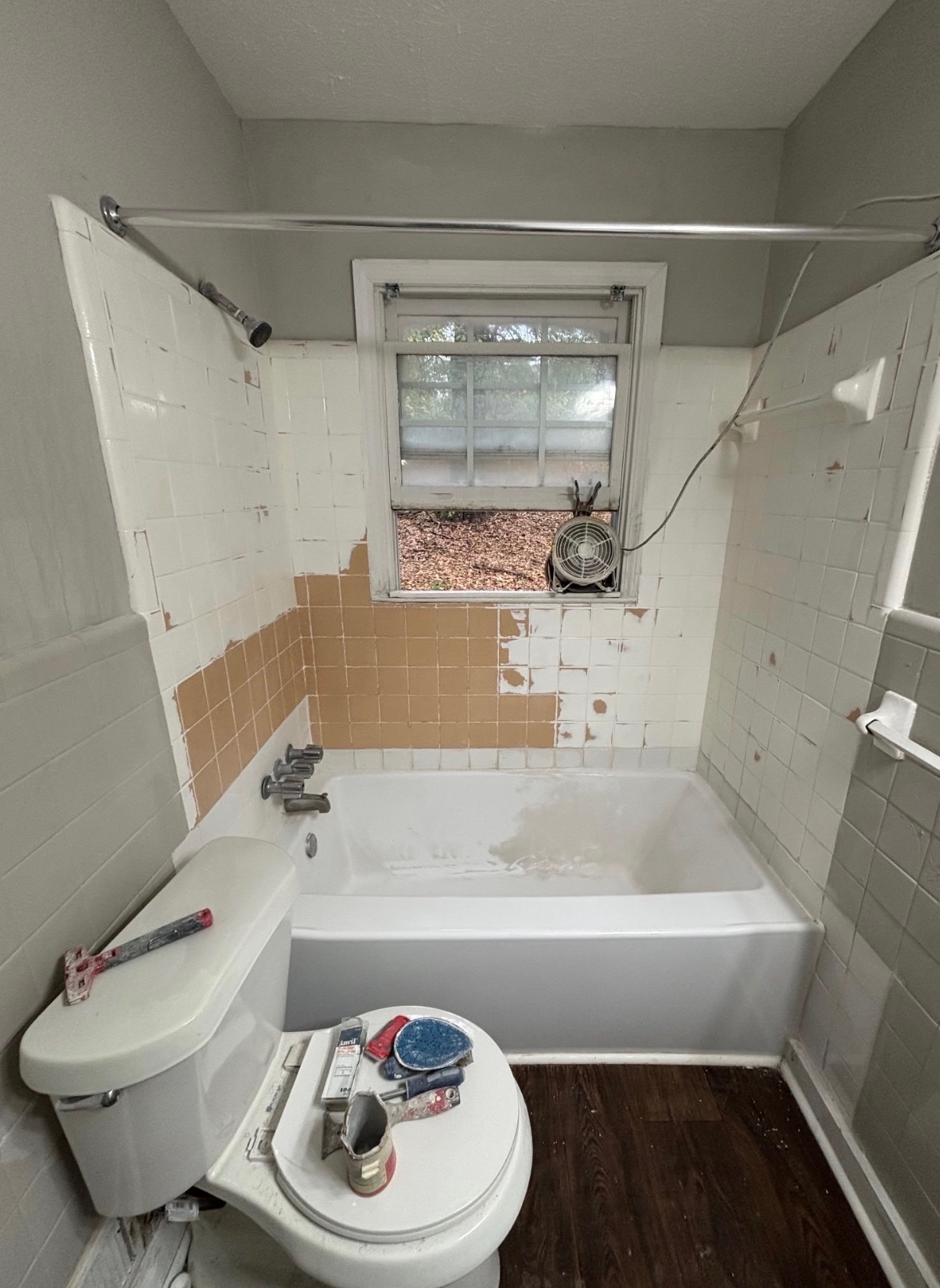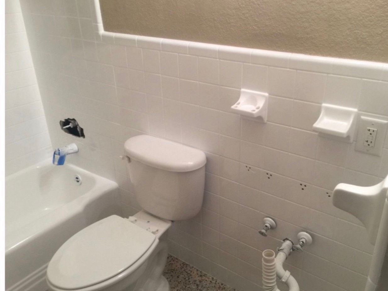 - Bathroom with toilet, tub, and tiled wall before resurfacing work.