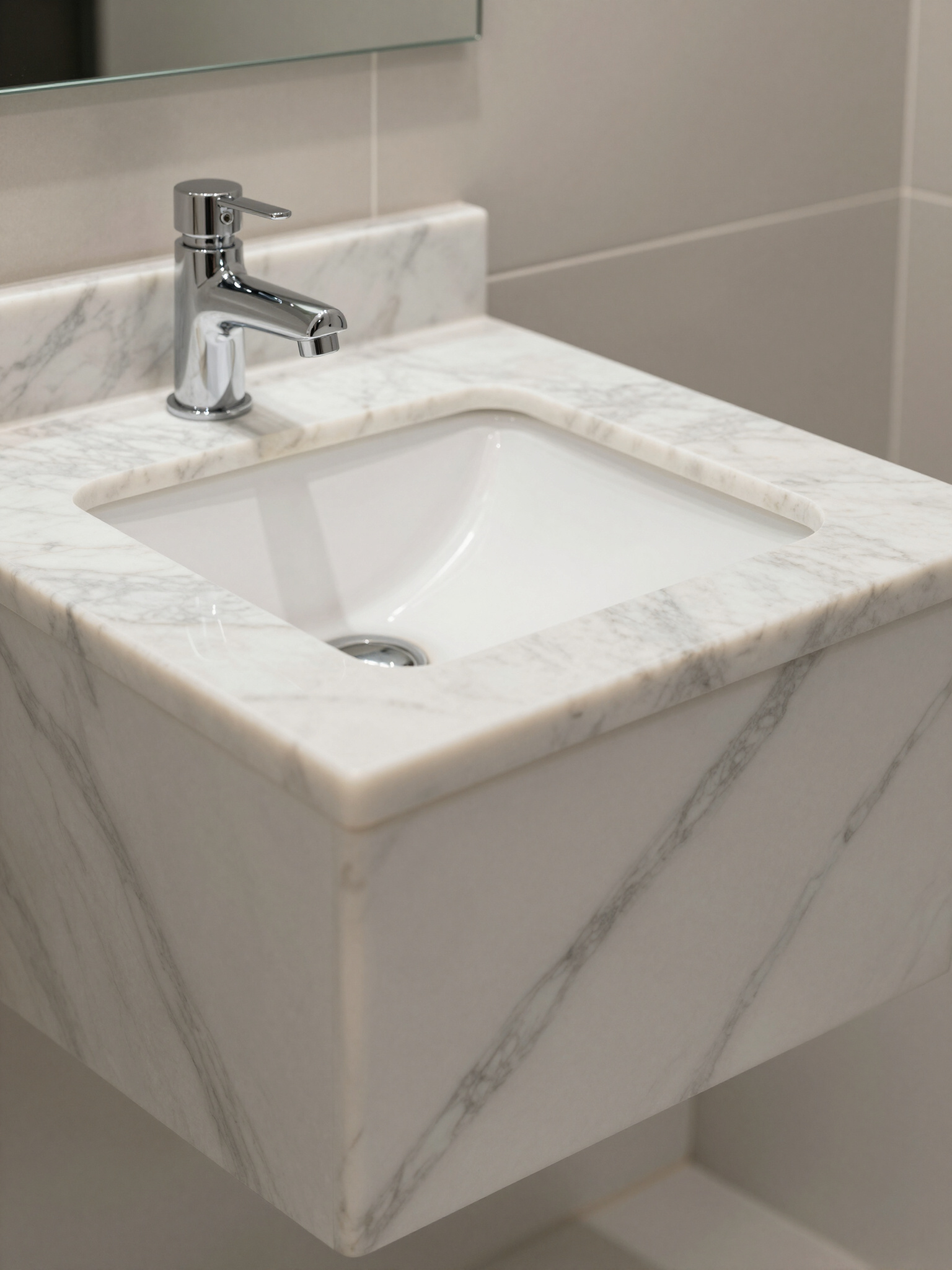 - White marble bathroom sink with chrome faucet