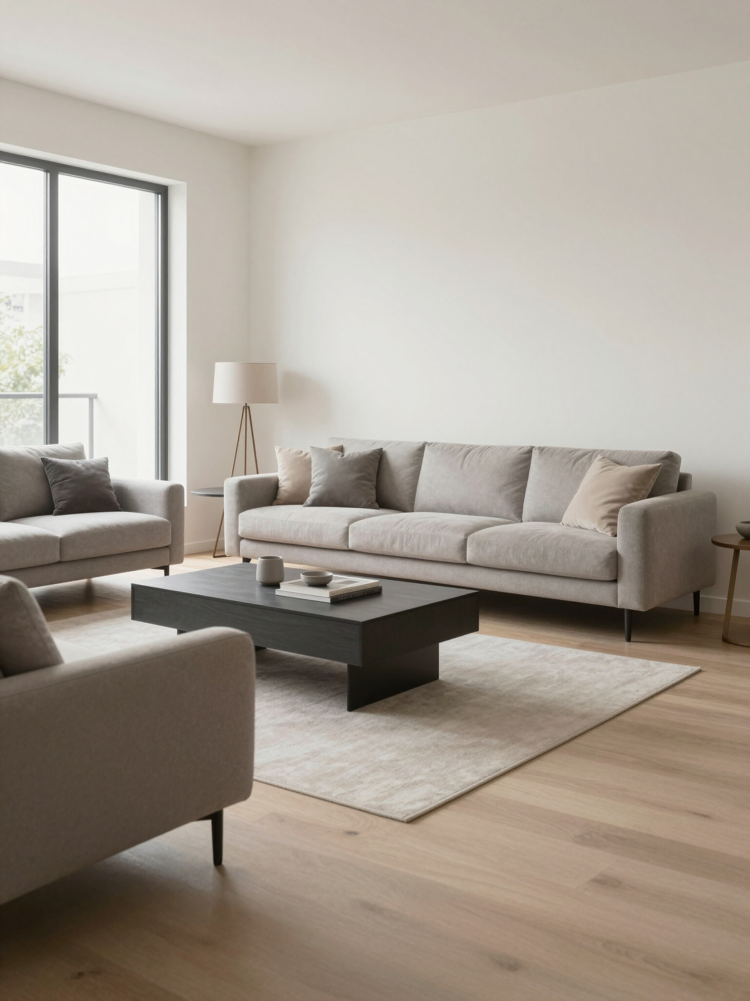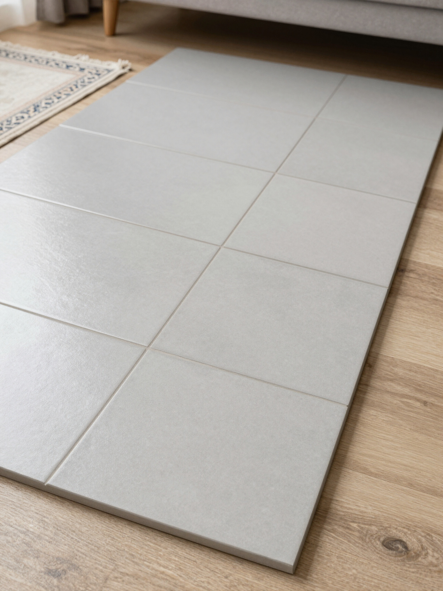 - Light gray modular floor mat on wood flooring