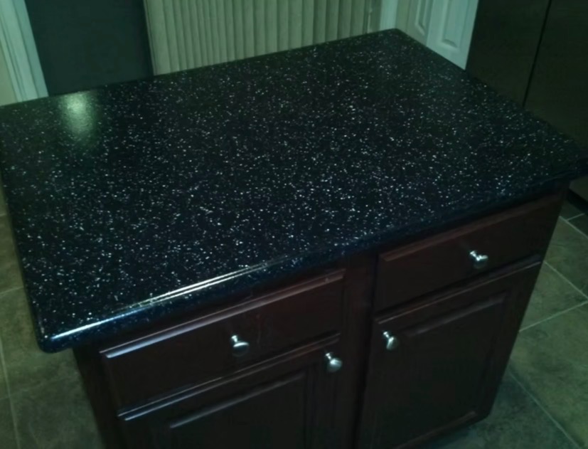 - Kitchen island with dark speckled resurfaced countertop