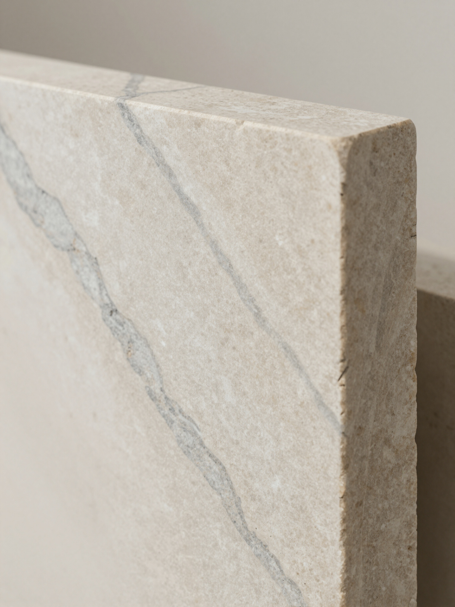 - Light, veined stone slab edge