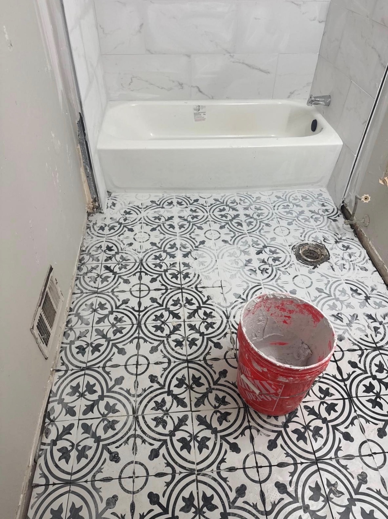 - Bathroom floor resurfacing work with patterned tiles.