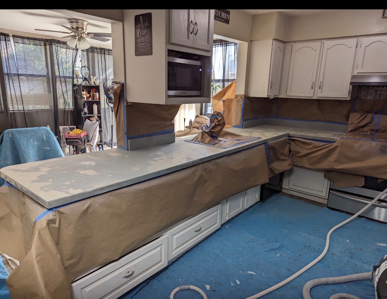- Kitchen prepared for resurfacing work with covered counters