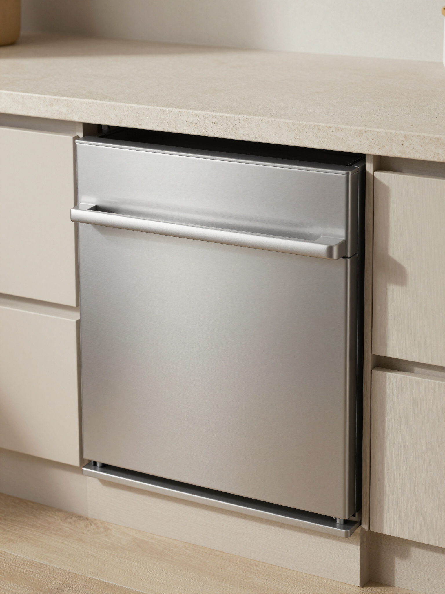 - Compact stainless steel appliance integrated into kitchen cabinetry
