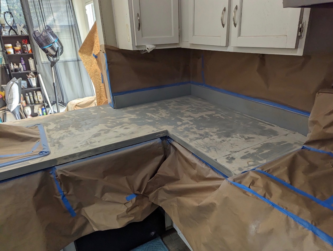 - Kitchen countertop prepared for resurfacing work